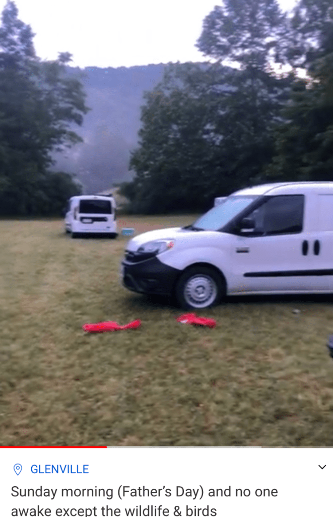 I woke up early to make a quick video while everyone was asleep including John. He left his red, collapsible chair bags outside his van. The sound of wildlife and birds resembled a nature’s rehearsing orchestra! Even the crows were cawing before 6:00 a.m. I really enjoyed the solitude of knowing the wildlife, birds, and I were all awake to hear their pretty songs. I hope you watch the attached video and listen to nature’s morning, glorified sounds in a remote, Little Bull Run “Holler” (hay field meadow) of Glenville, West Virginia…almost heaven.