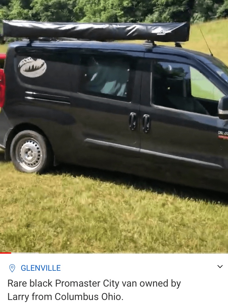 Imagine my surprise when I pulled into the meadow and saw Larry A. with Ohio license plates and a beautiful, black Cascade camper van with a batwing awning & cargo carrier attached to the hitch. For a Cascade van owner, it was like seeing a rare, precious stone! The silver cascade logo stood out like a beacon of light; very unique & noticeable. ⬇️