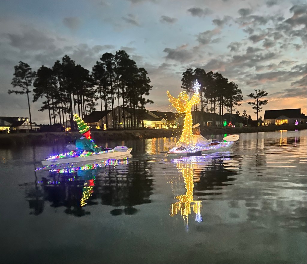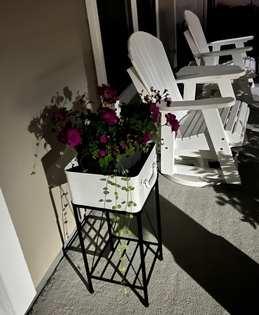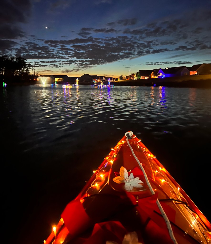 I’m waiting on my front porch in 50 degree temperatures. I’m completely mesmerized that my violet geraniums are still blooming! We had 70 degree weather on Saturday evening when I participated in the annual kayak flotilla on our community’s manmade lake – 12/18/21.