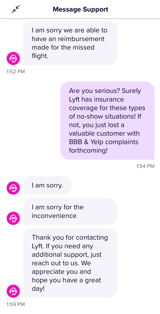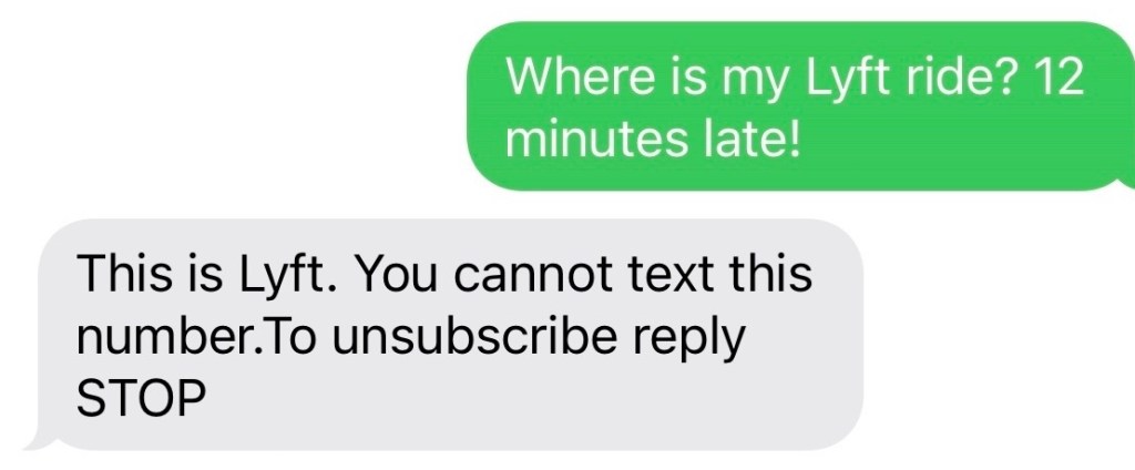 This afternoon , I texted Lyft’s website message help service. The following exchange took place: