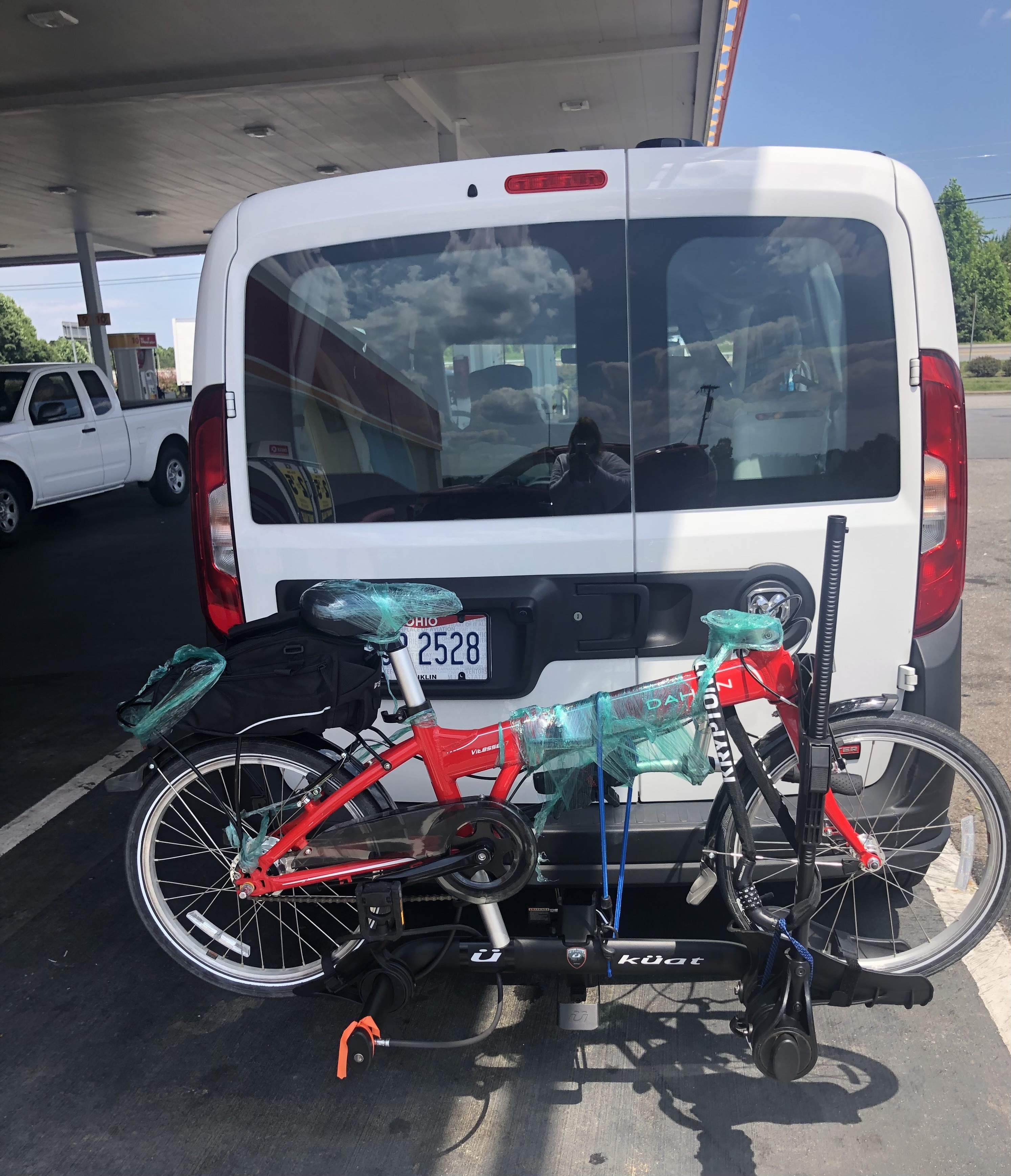 This summer, I installed a single carrier Kuat Sherpa bike rack on my camper van. It weighs 29 pounds & holds one bicycle. And my lightweight, foldable Dahon bicycle creates little wind drag behind the van. I use green furniture wrap to keep the foldable handlebars & seat protected against the wind & rain. I’m still averaging 28 miles per gallon driving my Ram Promaster City camper van with bike & carrier attached. Now I can cycle several blocks to local beaches, marinas, & parks if I cannot find free, available parking nearby.