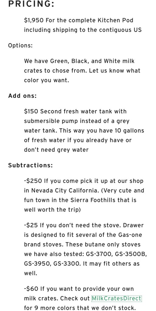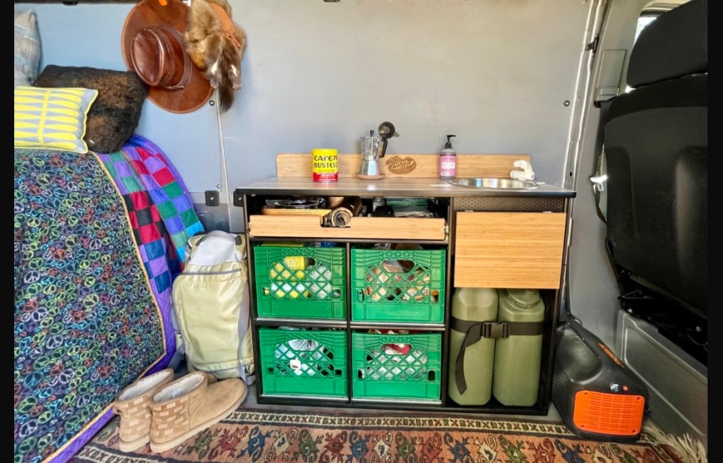 Cascade is now offering a self-contained kitchen pod for sprinter vans. Their $1950 USD pod is specifically designed for mid-size and full-size vans. They do not offer a kitchen pod configuration for micro vans. Here is the website link if you’re interested in purchasing one: https://www.cascadecampers.com/kitchenpod
