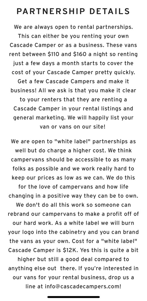 How to purchase a new or resale Cascade camper van for rental partnership and/or personal usage