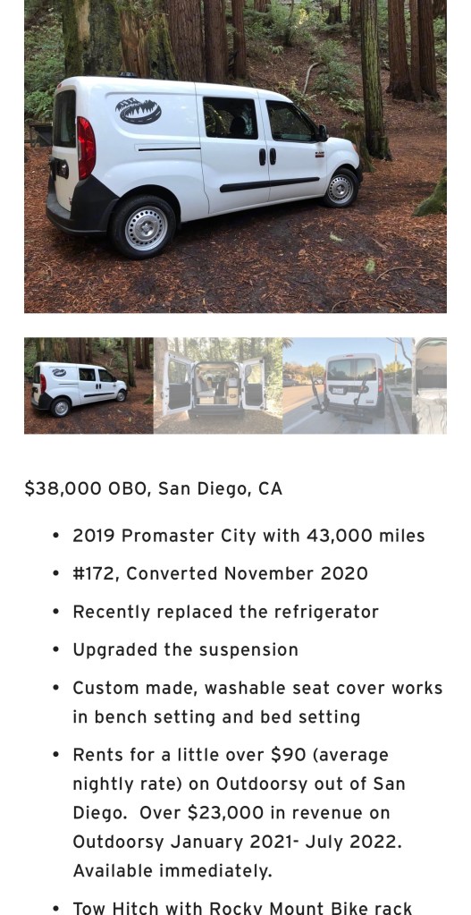 I picked the above listing (on 1/27/23) to highlight Cascade camper van resales currently available for purchase. It visually illustrates the monetary value maintained after purchasing a Cascade conversion package three years ago! Just like the older, Volkswagen Westfalia camper vans of yesteryear, I anticipate the same consumer desirability & resale longevity for Cascade camper vans. Anyone else think differently?