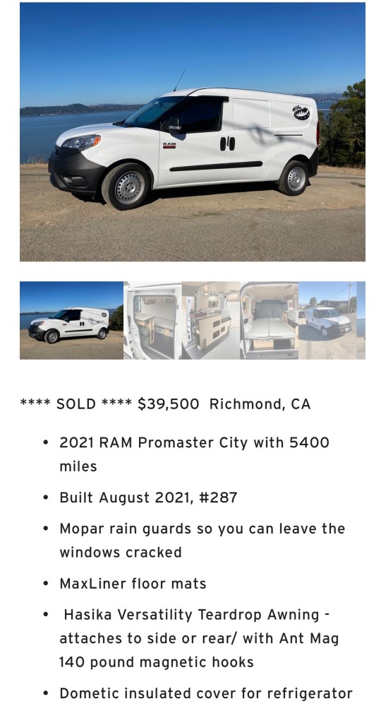 I now have a favorite, new webpage: The Cascade Camper resale & sold listings. I cannot believe how much these micro vans are selling for used! I invested $38K in my brand new Cascade camper van in November 2020, build #167 including extra options. With less than 11K current mileage on the odometer, I could probably sell it to a third party for more $ than originally invested. Consumer demand & inflation have increased, not decreased!